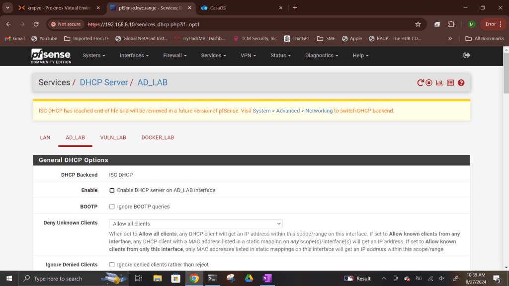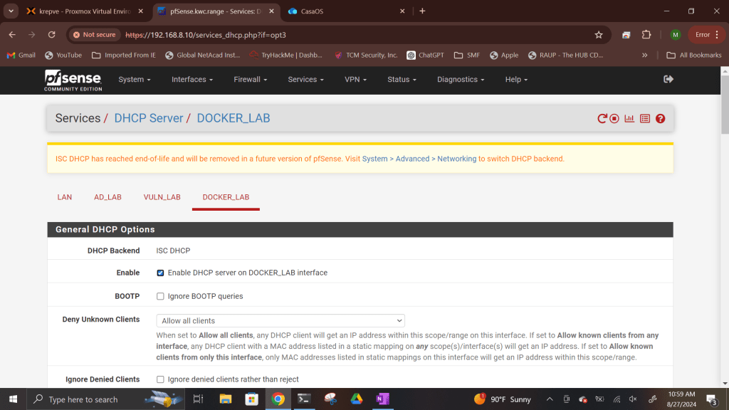 Enable DHCP Server on Interfaces: In order for any virtual machines to be added to the network and receive an IP address, there has to be a DHCP server on each vlan. I enabled and setup DHCP on each vlan interface and set DHCP scopes except for one. That vlan interface will have DHCP taken care of by another operating system: Windows Server 2022.
