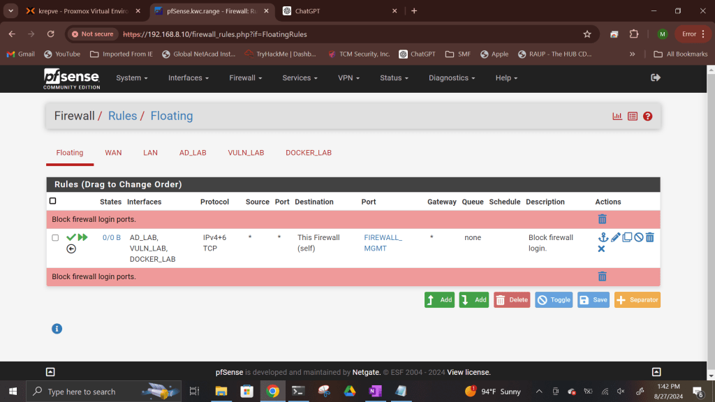 Floating Rules: To prevent unauthorized access to the firewall’s management port, I set up floating rules that blocked access from all VLANs. This extra measure adds another layer of security, ensuring that even if someone gains access to a VLAN, they won’t be able to tamper with pfSense itself.