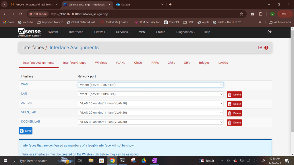 The first step in building my virtual lab network was configuring multiple VLANs (Virtual Local Area Networks) and their interfaces in pfSense. VLANs are crucial for isolating different types of traffic within the same physical network, adding an extra layer of control and security. Here’s what I configured: